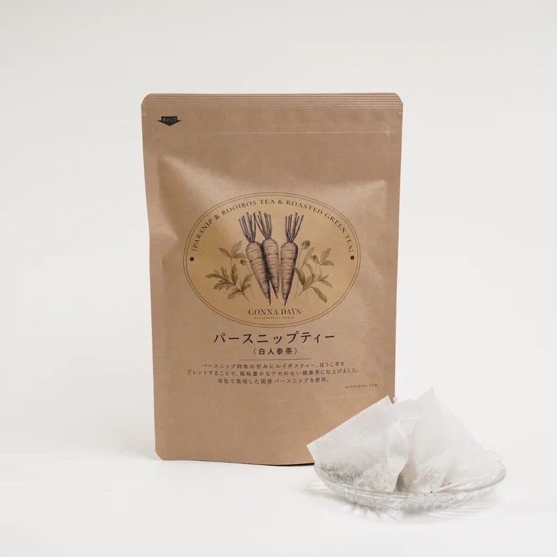 パースニップは抗酸化作用が高く、アンチエイジングが期待でき、国産では希少な西洋野菜。⾹り⾼いルイボスやほうじ茶をブレンドし、クセがなく飲みやすいカフェインレスの健康茶に仕上げている。