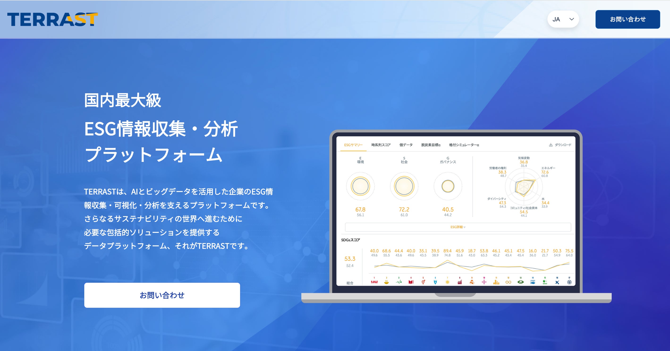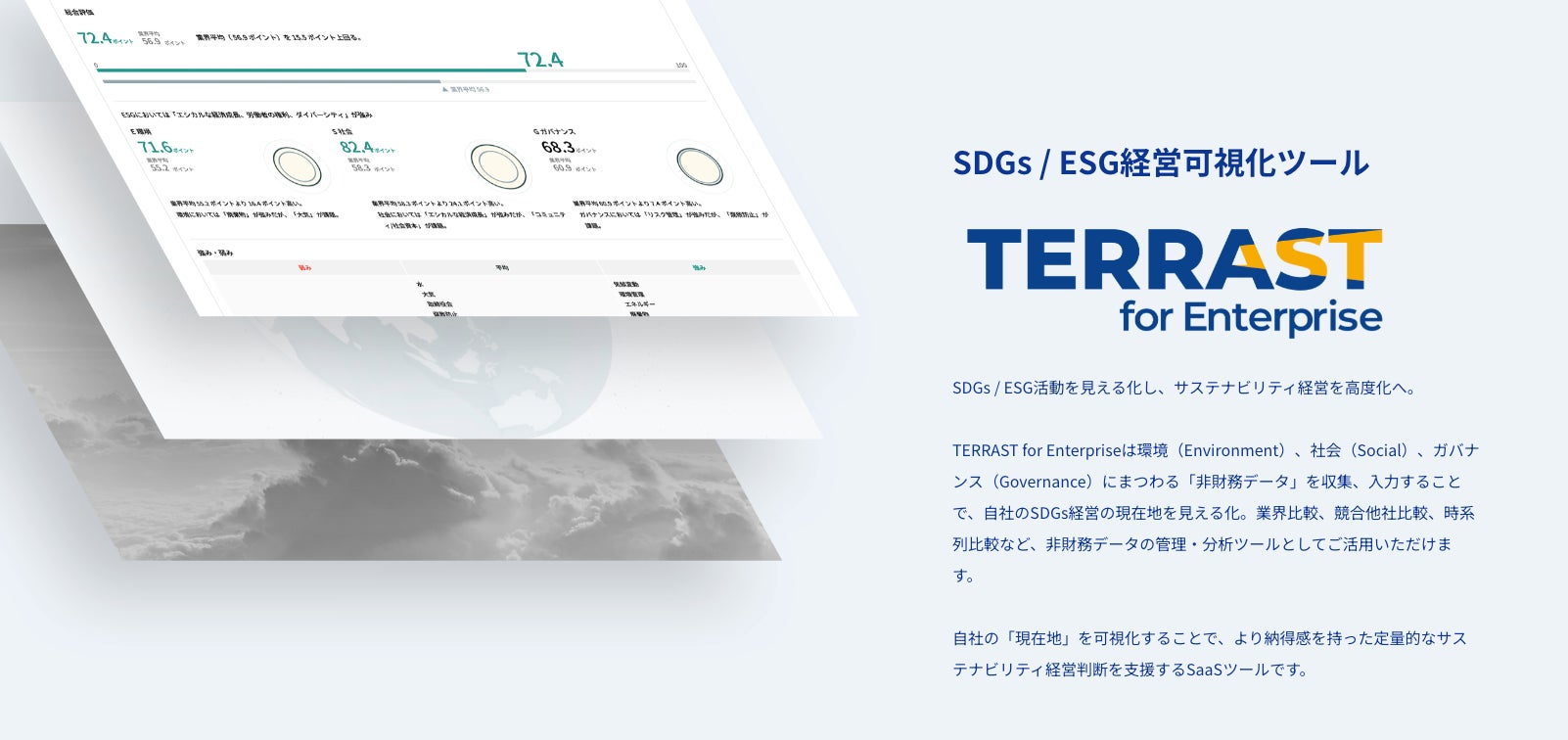 定性的に語られやすい企業の環境・社会貢献度をビッグデータとAIを用いて定量化する、国内最大級の非財務データプラットフォーム「TERRAST」や非財務・サステナビリティデータ開示・分析支援ツール「TERRAST for Enterprise」を開発・提供。非財務指標と財務指標の因果分析、相関分析も行う。データサイエンス × サステナビリティ × 金融工学領域の出身者による、ESG/SDGsに特化した非財務ビッグデータ集団として、社会・環境貢献と経済をシームレスに接続することを目指しています。日経グループによる「未来の市場をつくる100社(2023年版)」に選定。